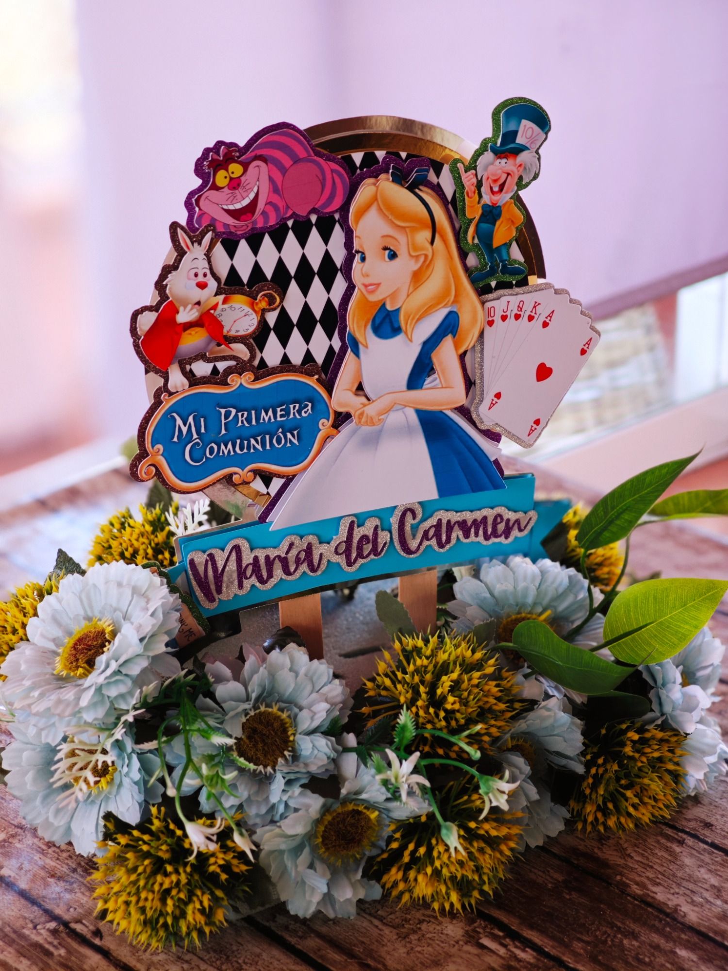 Los papis de Mª del Carmen se decidieron a última hora para la decoración temática basada en Alicia en el País de las Maravillas, así que sorprendieron a su hija con unos marcasitios que a su vez eran detalles para los invitados, los meseros y el seating.